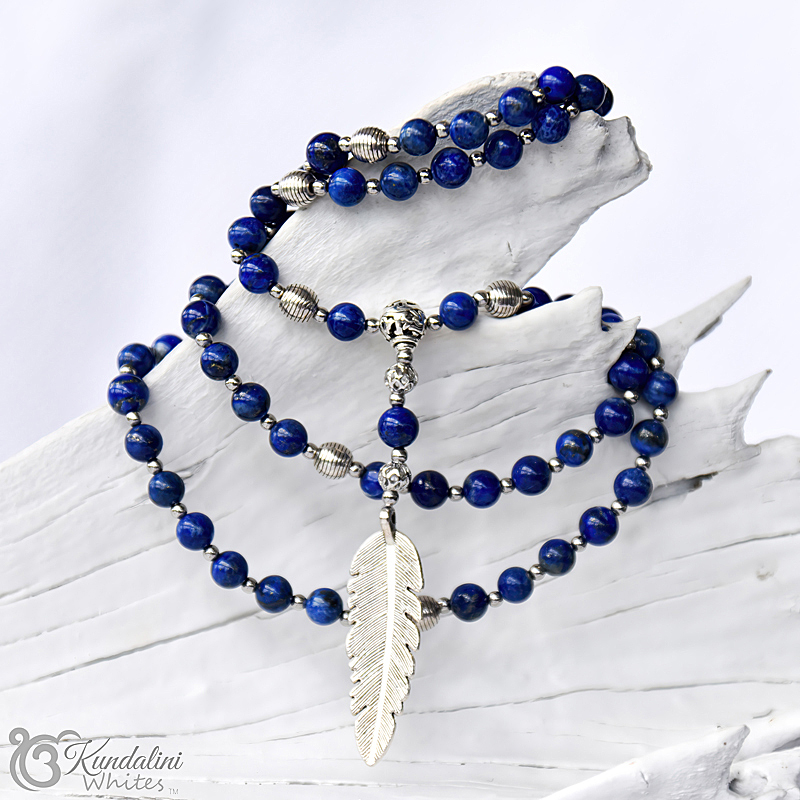 The main spiritual property of the Lapis lazuli mala is to heal the soul. Thereby making higher levels of spiritual growth possible. Lapis is believed to help recognise intuition and spiritual guidance. It cleanses the mind, body and spirit of negativity. It hence enhances very deep meditative states. Physically, it is said to alleviate insomnia and migraines, and to reduce blood pressure and inflammation. Furthermore, lapis lazuli boosts the immune system.