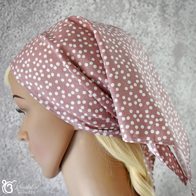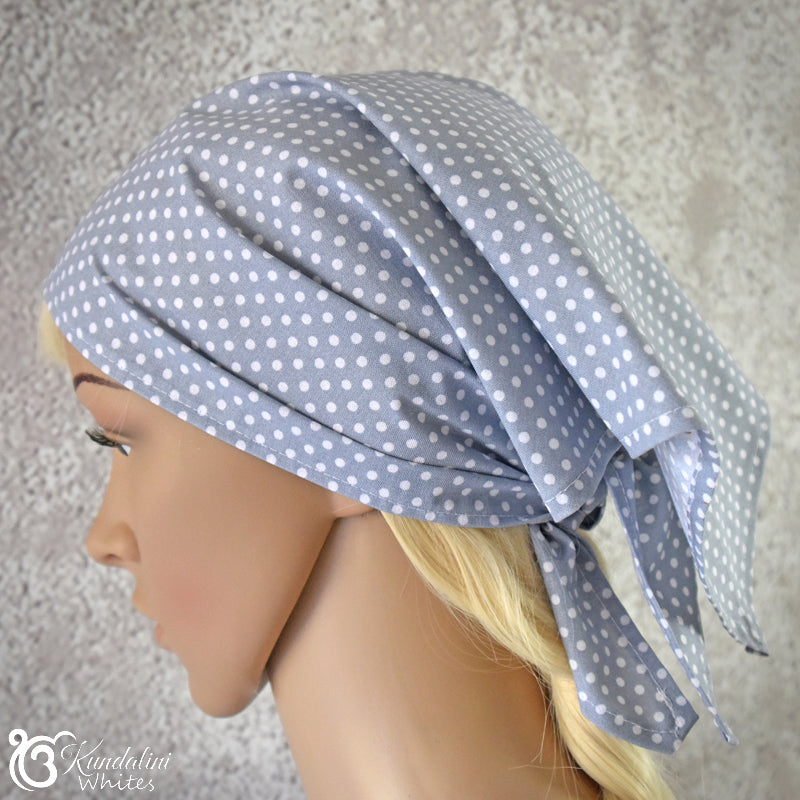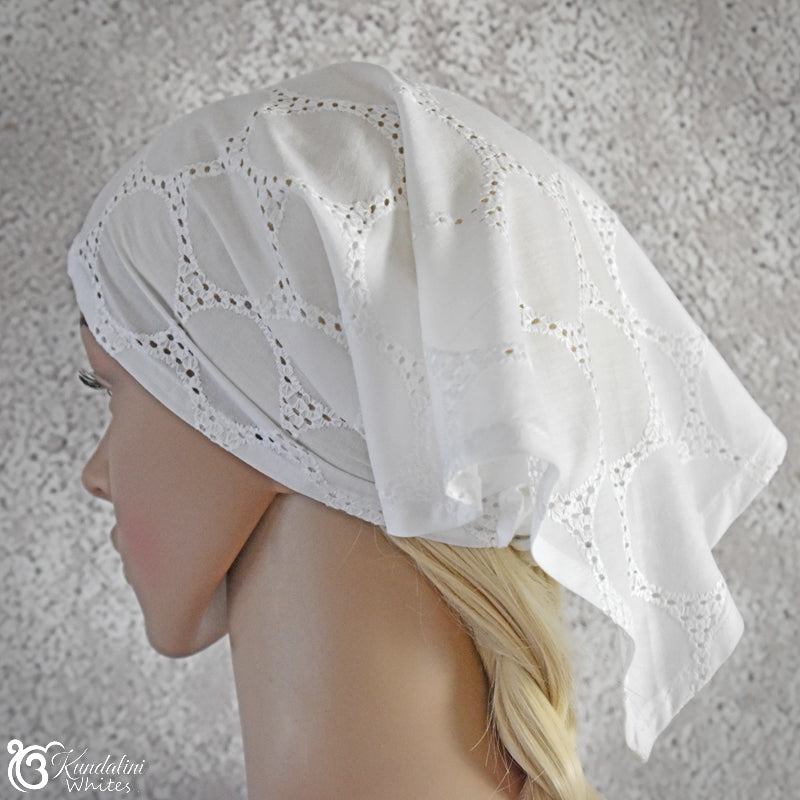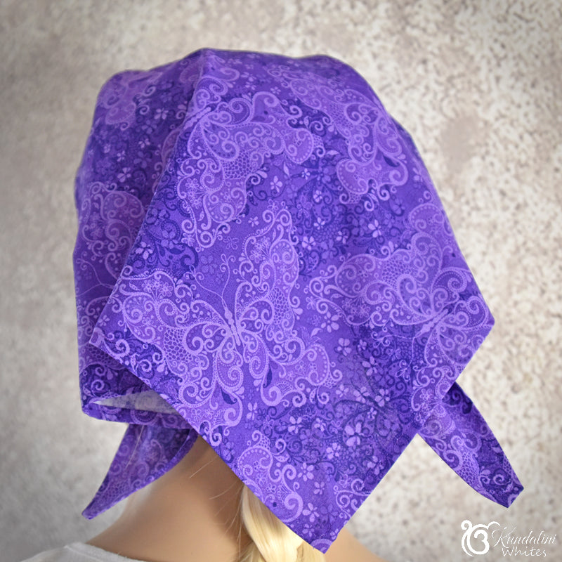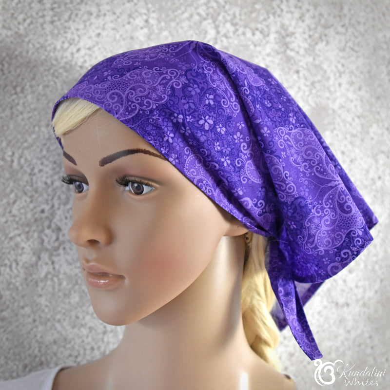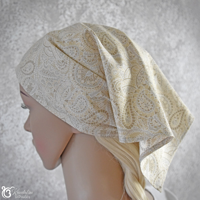 There are a number of fabric choices for this bandana scarf headwear. They include embroidered cotton voile, sturdy cotton akin to quilting fabric, as well as pure linen. Patterns of the fabrics will vary from time to time according to availability.